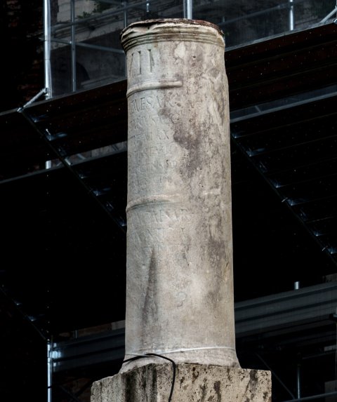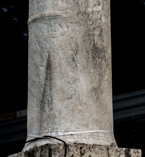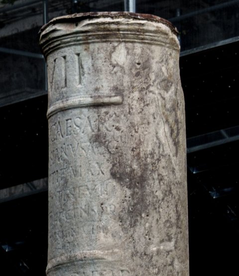 - VII / Imp(erator) Caesar / Vespasianus Aug(ustus) / pontif(ex) maxim(us) / trib(unicia) potest(ate) VII / Imp(erator) XVII p(ater) p(atriae) censor / co(n)s(ul) VII design(atus) VIII // Imp(erator) Nerva Caesar / Augustus pontifex / maximus tribunicia / potestate co(n)s(ul) III pater / patriae refecit