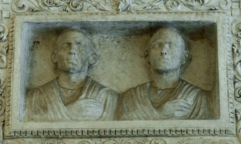 - Einfach gerahmte Rechtecknische mit bekleideten Büsten von zwei bartlosen Männern (links Vater, rechts Sohn ?).