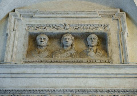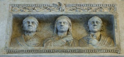 - Einfach gerahmte Rechtecknische mit drei bekleideten Büsten (Familie: Frau mit Schleier zwischen älterem Mann links und Jüngling rechts).
