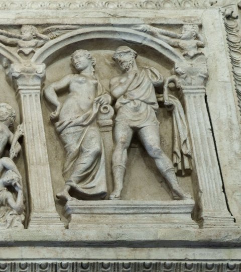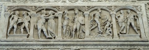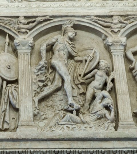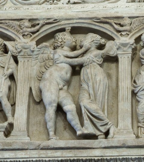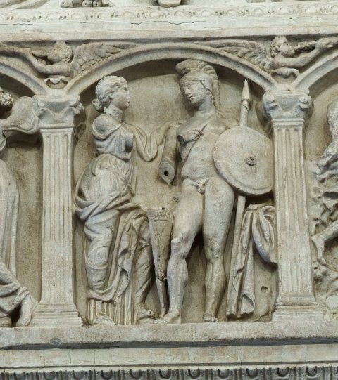 Säulensarkophag mit fünf Arkaden auf kannelierten Pfeilern. Mythos: in der mittleren Arkade Mars und Venus, rechts davon Mars und Rhea Silvia; ganz rechts Quellnymphe und Hirt, die die Szene beobachten. Unter der Arkade links der Mitte Eros (Amor) und Psyche, ganz links zwei Eroten, die jeder ein vexillum halten und zwischen sich einen Helm.