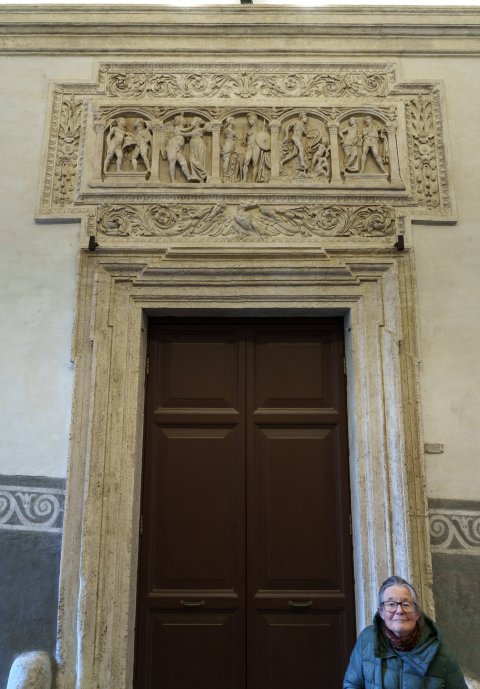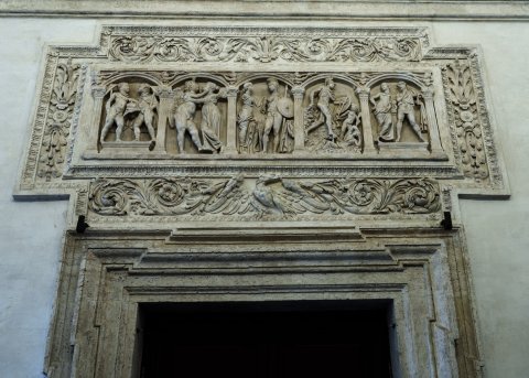 - Frontseite, rundum beschnitten, Reliefs von verschiednenen Sarkophagen ? Rahmen frühes 17. Jh.