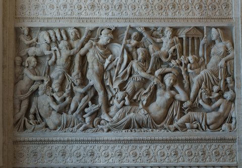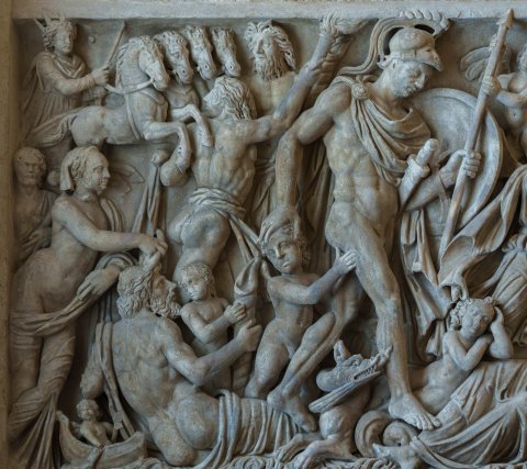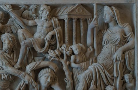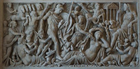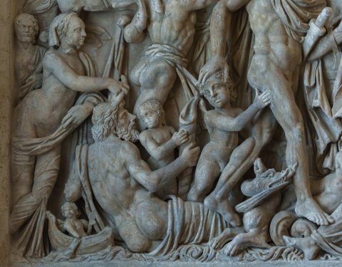 - Mythos: im Zentrum der auf Rhea Silvia zuschwebende Mars, links oben Sol mit Viergespann, rechts oben der sitzende Vulcanus und die vor ihrem Tempel thronende Venus. Unten Flussgott, Eroten, Tellus.