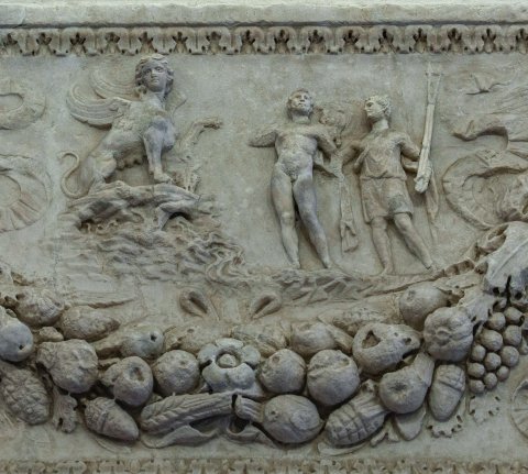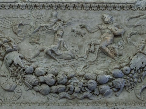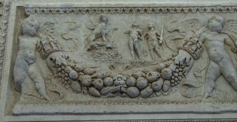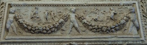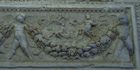 - Von drei Eroten getragene Fruchtgirlanden, in den Girlandenbögen Mythos: links Ödipus und Begleiter vor der Sphinx, rechts Polyphem und Galathea auf einem Meerwesen.
