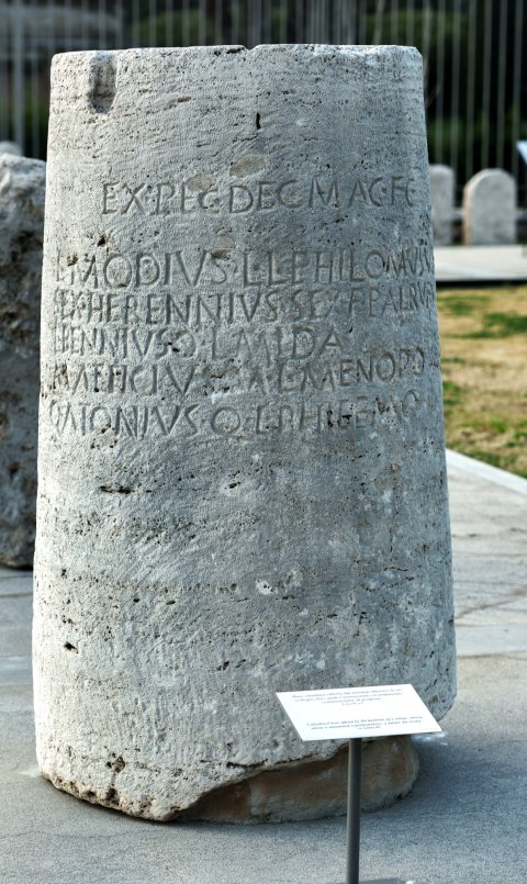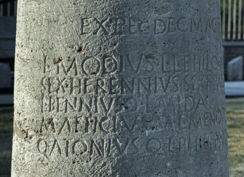 - Ex pec(unia) dec(urionum?) mag(istri) f(aciendum) c(uraverunt) / L(ucius) Modius L(uci) l(ibertus) Philomusus purp(urarius) / Sex(tus) Herennius Sex(ti) f(ilius) Pal(atina) Rufus / L(ucius) Bennius |(mulieris) l(ibertus) Mida / M(arcus) Aepicius M(arci) l(ibertus) Menopo / Q(uintus) A(n)tonius Q(uinti) l(ibertus) Phi<l=E>emo