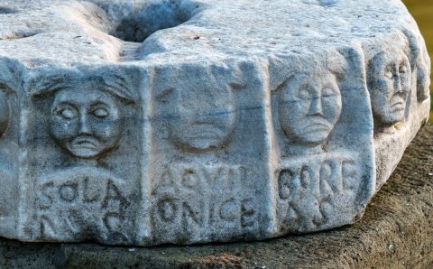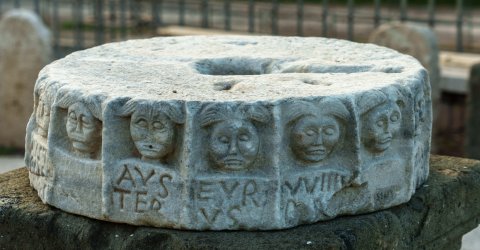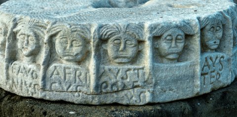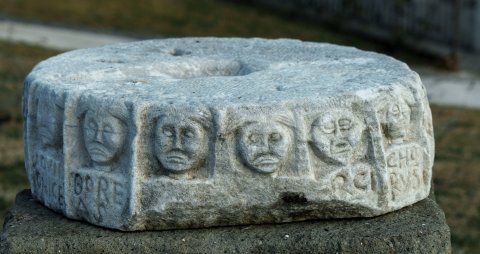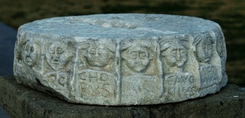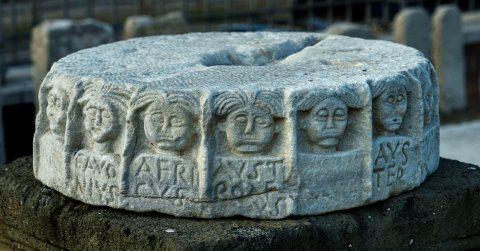 - Zylindrischer Stein mit Reliefbüsten von 16 Windgöttern, 11 mit Namensbeischriften. anemoscopium (Gerät zur Bestimmung der Windrichtung)