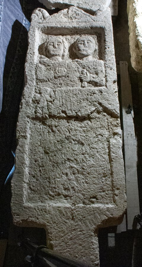 - Giebel mit Rosette und Seitenakroteren. Im Hauptbild zwei Brustbilder (Ehepaar). Links Frau: Frisur der Fausta, Ärmeltunica, in der Rechten Apfel. Rechts Mann: bärtig, kurzes Haar, Ärmeltunica, Sagum, Zwiebelknopffibel, in der Linken Rolle (volumen). Zwischenbild mit Totenopfer ?