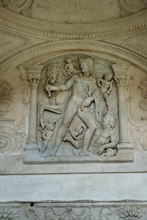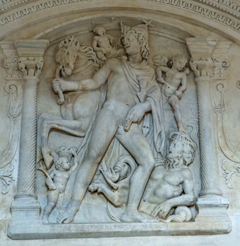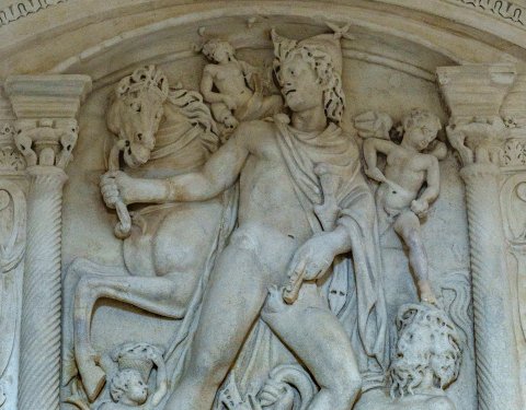 - Mythische Figur: zwischen Säulen mit Spiralkannelur, auf denen flacher profilierter Bogen liegt, Jüngling (Dioskur) mit Schultermantel und Pileus mit Stern, Ausfallstellung nach rechts, in der Rechten Zügel des hinter ihm sich aufbäumenden Pferdes, im linken Arm Schwert. Unten rechts Flussgott, oben gelagerte Nymphe; neben dem rechten Bein Erot mit Fruchtkorb, schwebender Erot neben der linken Schulter.