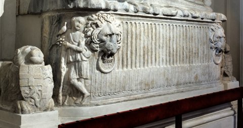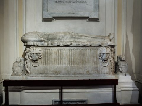 - nur Vorderseite u. Teile der Schmalseiten erhalten, Deckel fehlt (Grabplatte mit Liegefigur des R. Caracciolo von 1395)