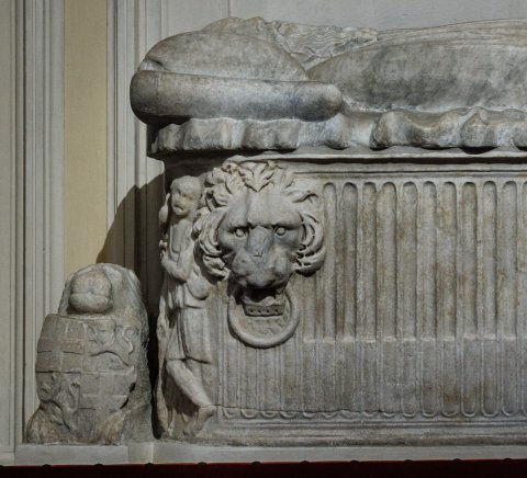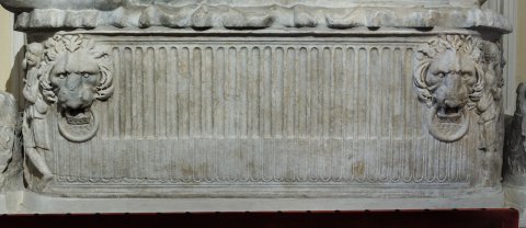 - Vorderseite kanneliert. an beiden Enden Löwenprotome mit Ring im Maul, auf den Schmalseiten je zwei männliche Figuren (Hirten ?) in kurzer Tunica, Bäume, Tiere.