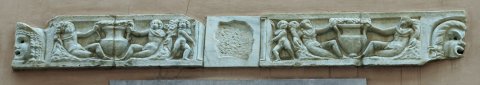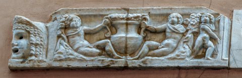 - Seitlich Akrotere in Form von Theatermasen. In der Mitte gerahmte, von Eroten gehaltene Schrifttafel, seitlich davon je zwei gelagerte Jünglinge mit Attributen der vier Jahreszeiten, zwischen ihnen ein Krater.