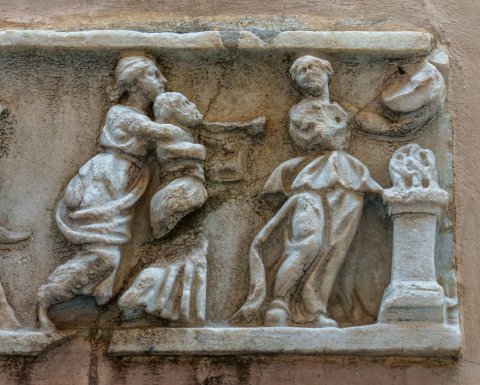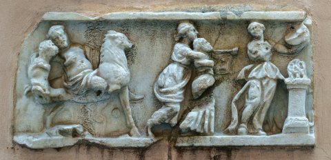 - Tiasos mit Silen, gestützt von Satyr, auf Maultier, davor zwei Mänaden und Mänade mit Tympanon an einem Altar.