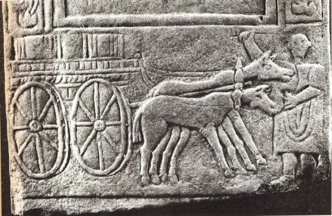 - Im Giebel: Rosette zwischen zwei früchtefressenden Vögeln. Sockelrelief: Wagenszene: unter dem Inschriftfeld, vierrädriger offener Karren mit zwei Fässern und zwei davorgespannten Maultieren nach rechts; vor den Maultieren stehender Mann mit Peitsche in der erhobenen Rechten. Beidseitig des Schriftfeldes Pilaster mit Ranken.