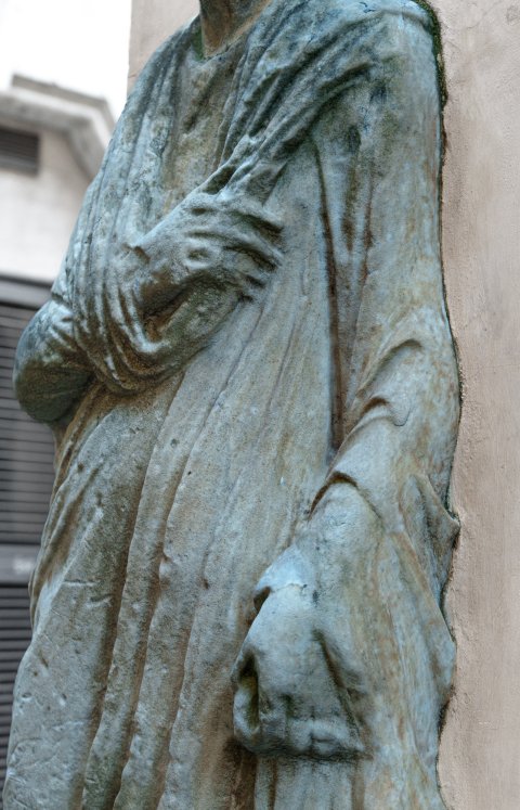 - Stehender Togatus, neben dem linken Bein Rollenbehälter, in der Linken Rolle (volumen).