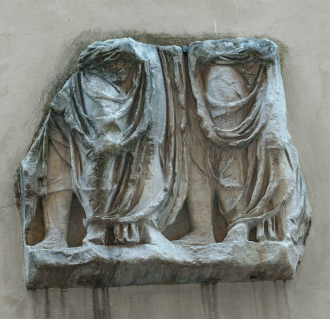 - Unterteil von zwei stehenden Togati, im Hintergrund Beine von zwei weiteren Personen in Schuhen und krurzem Gewand.