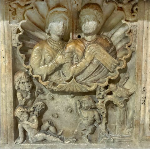 - Frontseite: profilierter Rahmen, innerhalb geriefelt, in der Mitte Feld mit Portraitmedaillon mit Muschelbaldachin mit Darstellung eines Ehepaars, in jeder der darüberliegenden Ecken ein Horn blasender Triton darunter drei nackte Eroten: einer mit Theatermaske vor dem Gesicht, einer mit Theatermaske neben sich, einer vor einer Höhle sitzend auf der ein Vogel sitzt und Weintrauben frisst.