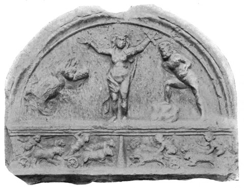 - Halbrundes Giebelfeld: Mythos: Andromeda mittig stehend, fast nackt an Armen gefesselt, links Seemonster, rechts stehender, nackter Perseus, das rechte Bein auf einen Felsen aufgestützt, rechte Hand mit Waffe hinter dem Rücken versteckt. Fries darunter: Wagenrennen von vier nackten, teils geflügelten Eroten mit je einem Zweigespann. Als Zugtiere links Panther und Hunde, rechts Löwen und Ziegen. In der Mitte Säule.