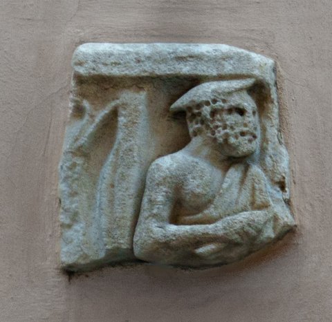 - Oberteil eines nach rechts gewandten bärtigen Mannes mit Hut und Tunica, die die rechte Schulter freilässt, in der rechten Hand Stiel eines Werkzeugs (?). Links anschließend senkrechte Leiste, links davon Reliefreste.
