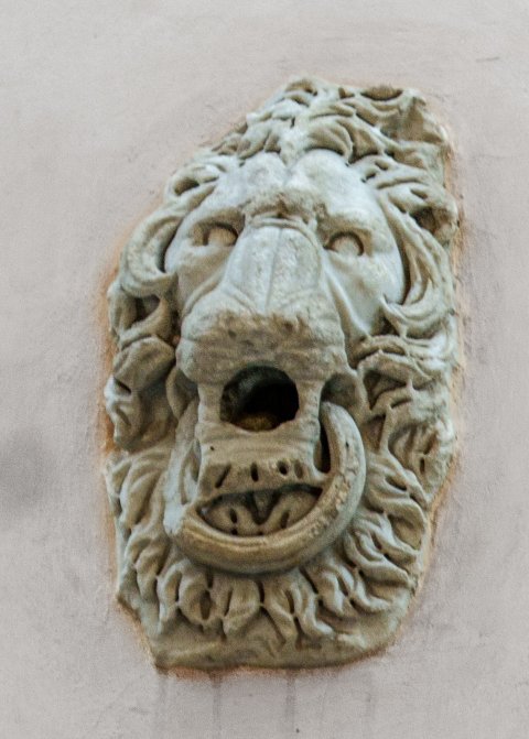 - Zwei Löwenkopfprotomen mit Ring im geöffneten Maul. Teile von Brunnenbecken ?.