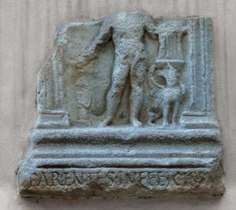 - Mythische Figur: zwischen Pilastern stehender Apollo mit Kithara, die auf dem Kopf eines Greifs aufliegt; unter der gesenkten Rechten Rundaltar oder Herme (?). Inschrift auf der Sockelleiste.