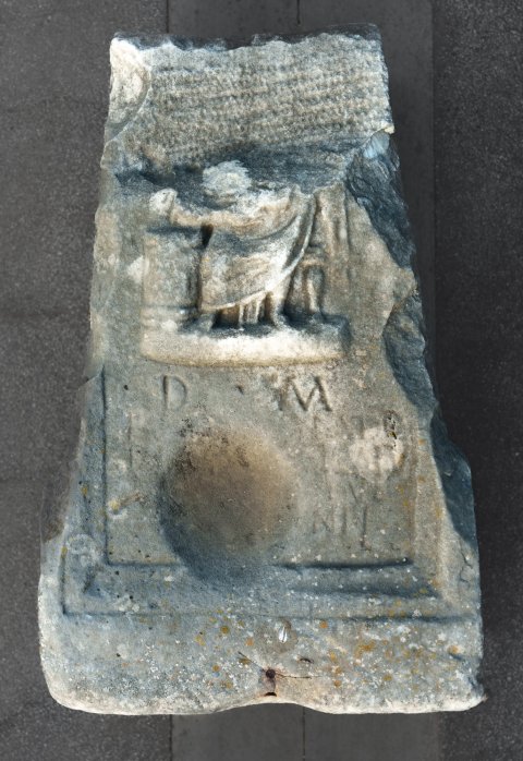 - oben abgebr., beide Seiten tlw. abgebr., Relief oben abgearbeitet, im Schriftfeld runde Aushöhlung