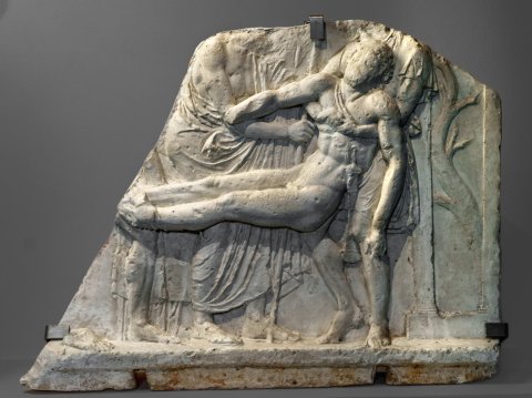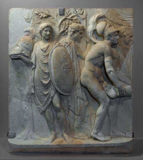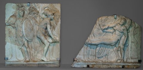 - Mythos (Meleager ?): Transport eines nackten Leichnams. Erhalten ist links ein Krieger mit Helm, der die Füße des Toten trägt, im Hintergrund Kopf eines älteren Mannes. Auf dem rechts anschließenden Fragment hält ein Mann in kurzem Gewand den Toten unter den Achseln, im Hintergrund Mann im Mantel, auf einen Stab gestützt und Bein eines weiteren Mannes. Rechts Säule (?) und Baum.