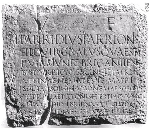 - V(ivus) f(ecit) / T(itus) Parridius Parrionis / fil(ius) Quir(ina) Gratus quaest(or) / IIvir munic(ipii) Brigantien(sium) / sibi et Parrioni Excingi f(ilio) patri / Vennae Nematevi f(iliae) matri / Solitae sorori v(ivae) Adnemae sorori / v(ivae) Tittoniae Tittonis f(iliae) Tertiae uxori / v(ivo) T(ito) Parridio Ingenuo filio / v(ivae) Parridiae Gratae filiae