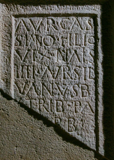 - D(is) M(anibus) // Aur(elio) Cas/siano filio / vix(it) annis / IIII Aur(elius) Sil/vanus b(eneficiarius) / trib(uni) pa/[te]r b(ene)/[m(erenti) p(osuit)?]