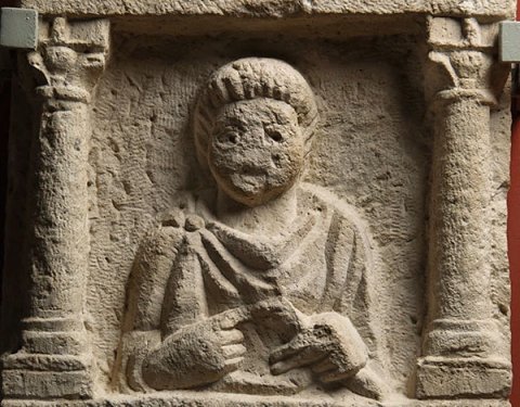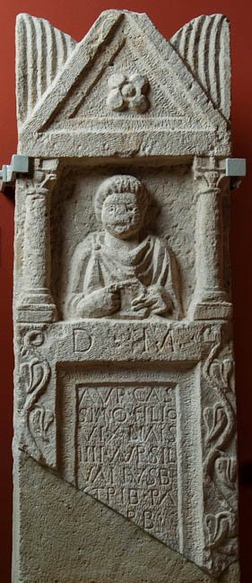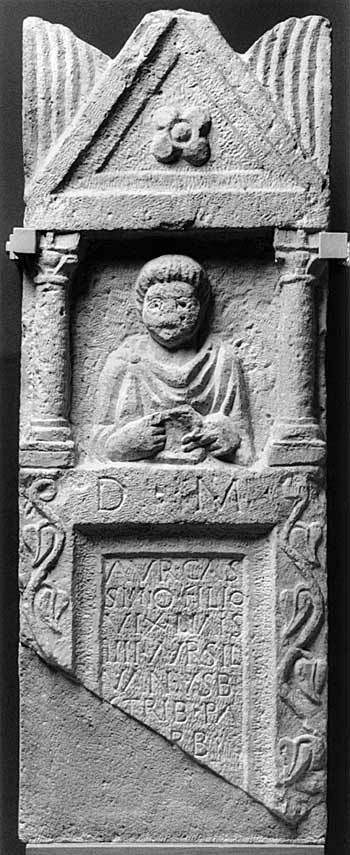 Im Hauptbild zwischen Säulen Brustbild eines Kindes (Knabe): Ärmeltunica, Sagum, Scheibenfibel, in der Linken Rolle (volumen). Auf dem Rahmen des Schriftfeldes Efeuranken. - Inschrift