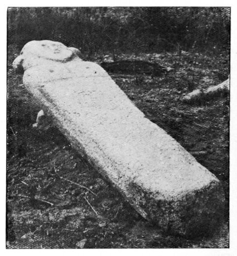 - Halbrunder Kopf mit oval umrahmten Gesicht. Augen, Nase und Mund einfach dargestellt. Auf beiden Seiten des Kopfes je ein abstehender Fortsatz (Haarbüschel?). Im oberen Bereich des Körpers angedeutete Brustwarzen. Entlang des Körpers stark stilisierte, an den Körper angelegte Arme.