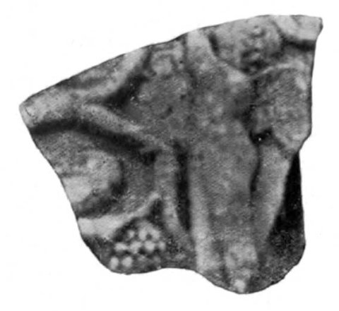 - Eroten bei der Weinlese. Links oben Weinstock, darunter Kopf eines Eroten mit Weintraube, rechts stehender geflügelter Erot.