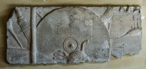 - Waffen (Tropaion): in der Mitte der Platte großer Rundschild mit Schildbuckel, davor Helm, links überschneiden eine Stange (Vexillumträger) und ein Ovalschild, hinter dem Rand des Rundschildes Schwerter, Lanzen, rechts oben Saum einer Draperie (Fahne ?).
