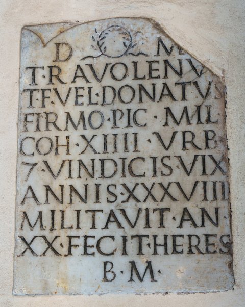 - D(is) M(anibus) / T(itus) Ravolenus / T(iti) f(ilius) Vel(ina) Donatus / Firmo Pic(eno) mil(es) / coh(ortis) XIIII urb(anae) / |(centuria) Vindicis vix(it) / annis XXXVIII / militavit an(nis) / XX fecit heres / b(ene) m(erenti)