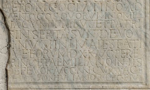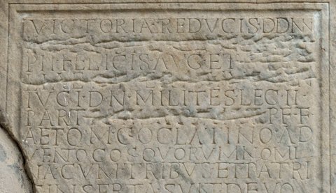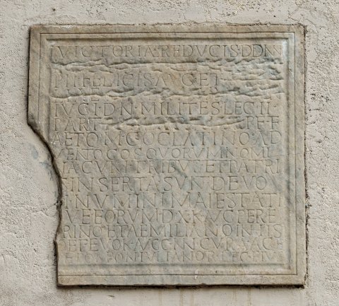- Victoriae reducis dd(ominorum) nn(ostrorum) / ⟦[Imp(eratoris) Caes(aris) M(arci) Iuli Philippi]⟧ / Pii Felicis Aug(usti) et ⟦[Otaci]⟧/⟦liae Se[verae]⟧ Aug(ustae) ⟦[con]⟧/iugi d(omini) n(ostri) milites leg(ionis) II / Parth(icae) ⟦[Philippianae]⟧ P(iae) F(elicis) F(idelis) / Aet(ernae) q(ui) m(ilitare) c(oeperunt) Oclatin[i]o Ad/vento co(n)s(ule) quorum nomi/na cum tribus et patri/is inserta sunt devo/ti Numini maiestati/que eorum d(ies) X K(alendas) Aug(ustas) Pere/grino et Aemiliano (!) in his / |(centuriones) et evo<c=K>(ati) Augg(ustorum) nn(ostrorum) cura(m) age/[n]te Pompon(io) Iuliano <|=R>(centurione) leg(ionis) eius(dem)