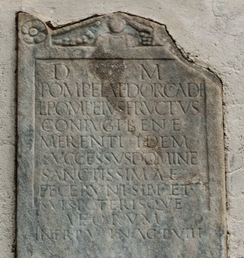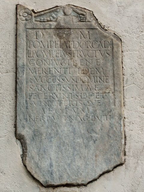 - D(is) M(anibus) / Pompeiae Dorcadi / L(ucius) Pompeius Fructus / coniugi bene / merenti idem / Successus domin(a)e / sanctissimae / fecerunt sibi et / suis posterisque / {a}eorum / in fr(onte) p(edes) V in ag(ro) p(edes) VIII