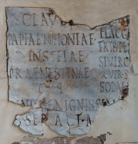- vollständiger Text : Tib(eriae) Claudiae / Camiliae Alfidiae / Celonide / c(larissimae) f(eminae) // Claudiae / Papiae Netoniae / Insteiae / Praenestinae / c(larissimae) p(uellae) // L(ucio) Insteio L(uci) [f(ilio)] Hor(atia) / Flacciano pr(aetori) <c=K>(andidato) / trib(uno) pl(ebis) <c=K>(andidato) quaest(ori) urb(ano) / seviro turmarum / Xvir(o) stlitib(us) iudicand(is) / sodali Hadrianal[i] // Dominis benignissimis / Faustinus ser(vus) act(arius) ar<c=K>(ae) ex Africa