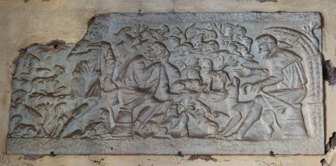 - Tiere (Schafe, Hund): Drei Hirten, links auf Pedum gelehnt, in der Mitte und rechts auf umgestülptem Korb sitzend, inmitten ihrer Herde.