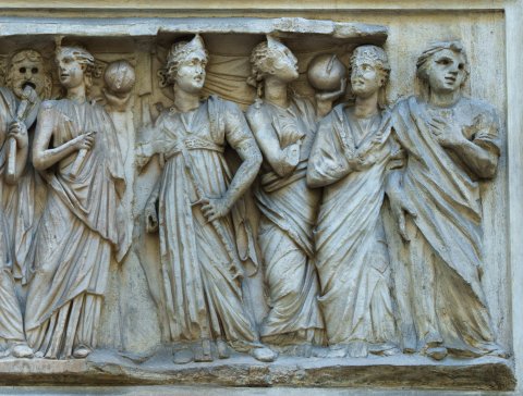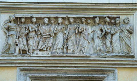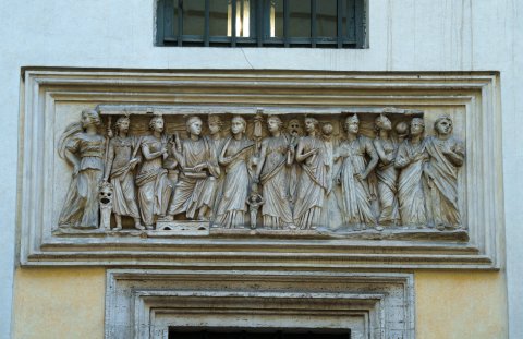 - Mythische Figuren: Musen mit Federkopfschmuck, zwischen ihnen stehende und sitzende Frau mit Scheitelzopffrisur, die Sitzende mit Schriftrolle (volumen).