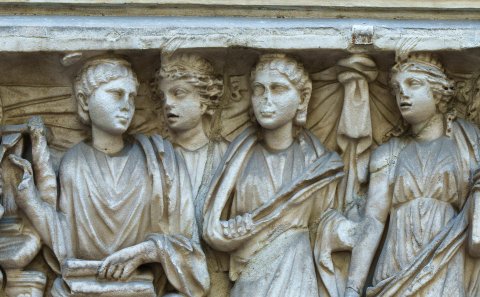 - Frontseite, Reliefteile abgebr., seitliche Figuren im 16./17. Jh. hinzugefügt