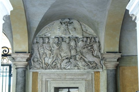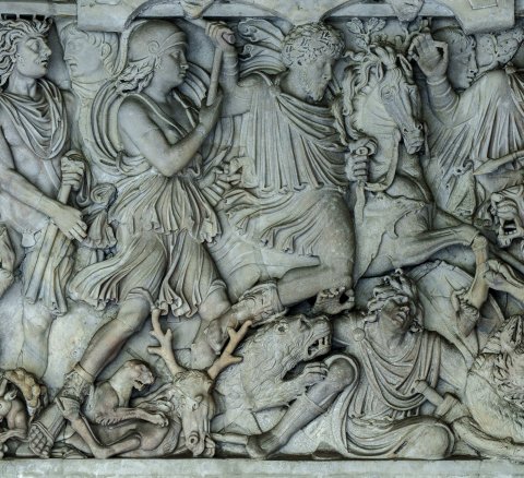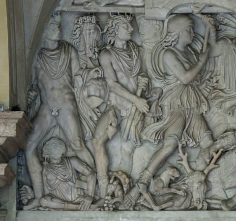 - Jagdszene mit zentralem Reiter und von rechts kommendem Löwen; links vom Reiter Virtus in kurzem Chiton und Helm, hinter ihr die Dioskuren. Unten weitere Tiere (Panther, Hirsch, Bär, Eber, Hund) und gestürzte Jäger