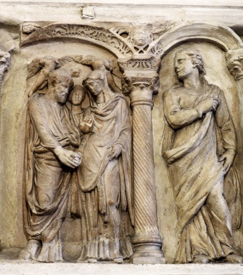 - Frontseite, rundum beschnitten, Reliefteile abgebr., Ergänzungen, aus verschiedenen Sarkophagfragmenten zusammengesetzt