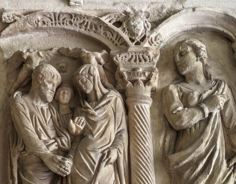 - Mythische Figuren: Säulensarkophag mit Arkaden, in der mittleren von einem anderen Sarkophag stammende Hochzeitsszene mit darüber schwebenden Eroten. Links davon zwei Interkolumnien mit je einer Muse; in den rechten Interkolumnien eine weibliche Figur, Ergänzung des 16./17. Jhs., und ein Mann in kurzer Tunica und Stiefeln, tlw. antik, aber nicht zugehörig.