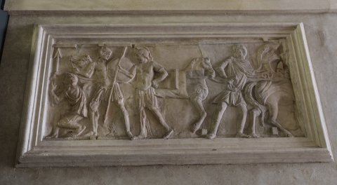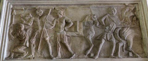 - Links zwei nach links gehende Krieger mit Waffen (Schild, Speer, Panzer, Helm), der vordere führt Pferd am Zügel, vor ihm Mann in halb kniender Haltung. Rechts Mann in kurzer Tunica, der ein Pferd hinter sich herzieht; ganz rechts weiteres Pferd.