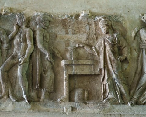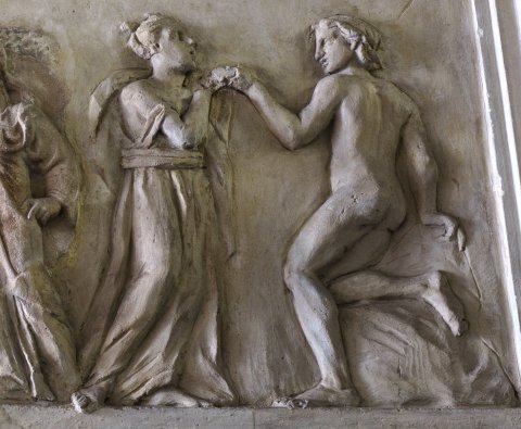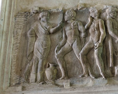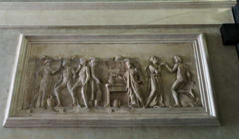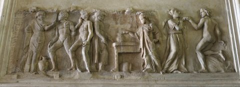 - Mythische Figur: rechts an einem Tisch stehende Athena mit Helm, die rechte Hand berührt ein Gefäß auf dem Tisch, unter dem Tisch liegendes Gefäß. Athena gegenüber stehender Jüngling, in beiden gesenkten Händen Werkzeug (?). Die links anschließenden Figuren vermutlich von einem anderen Relief: zwei nach links gehende nackte Jünglinge, vor ihnen Frau, die sich zu ihnen umwendet. Das tanzende Paar rechts ist neuzeitlich hinzugefügt.