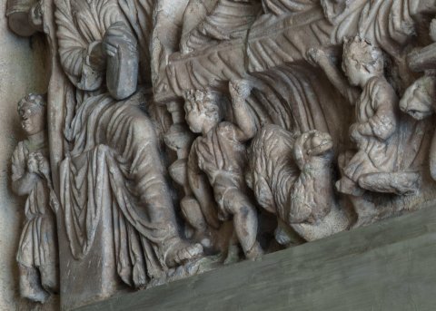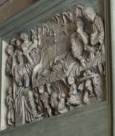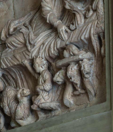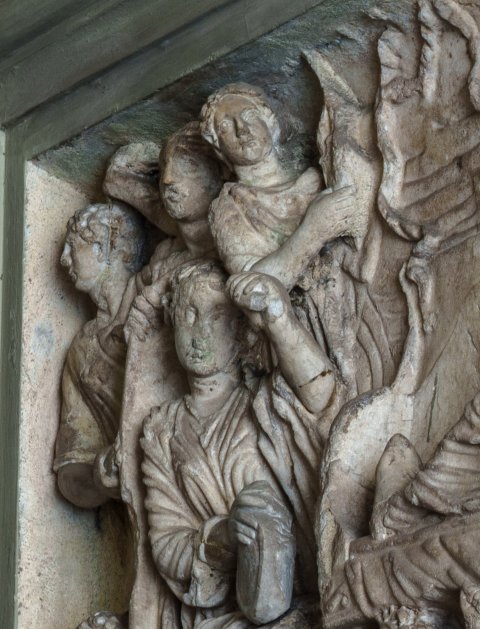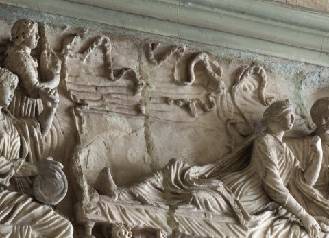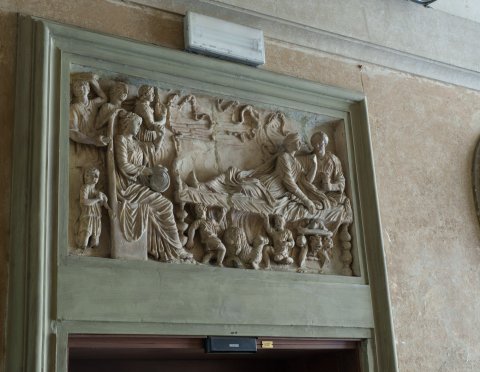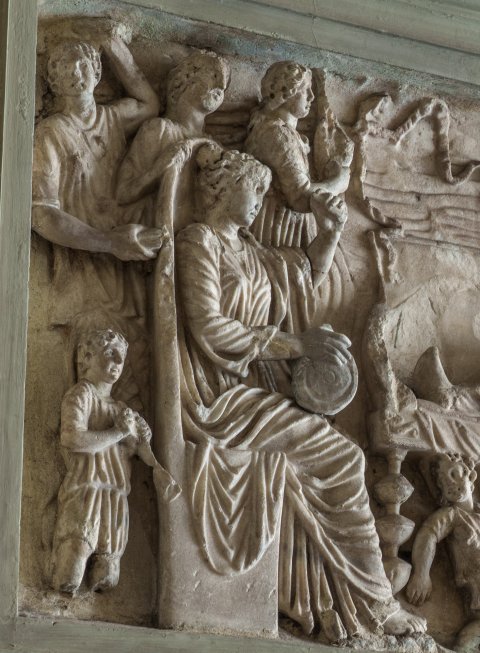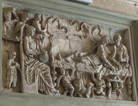 - Totenmahl: auf einer Kline gelagertes Ehepaar; vor der Kline Tischchen mit Löwenfüßen, zwei Knaben mit Hund; am Fußende der Kline Frau in Sessel mit hoher Lehne, dahinter stehender Knabe (Diener); links oben Oberkörper eines Dieners und von zwei Mädchen.