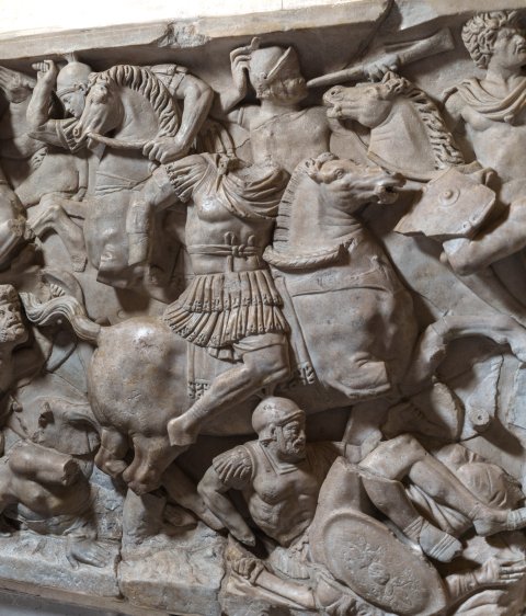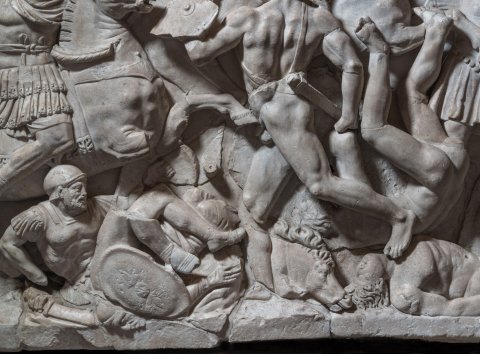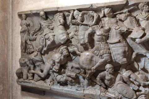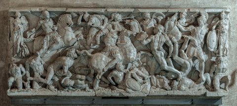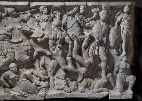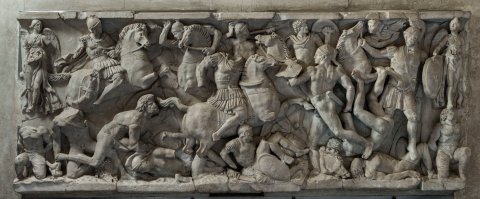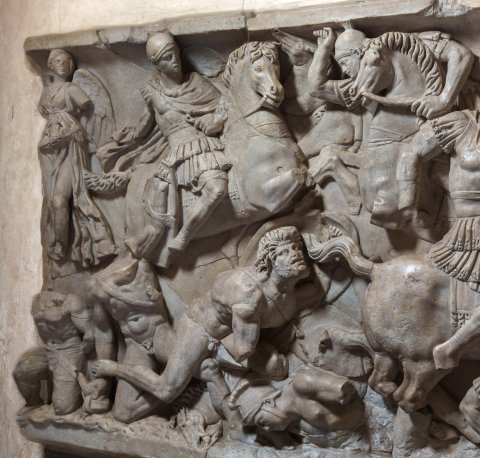 - Schlacht, im Zentrum Pferd mit dem Feldherrn, seitlich und im Hintergrund weitere Reitersoldaten, die Gegner (Barbaren, Gallier) sind nackt bis auf den Helm; auf dem Boden Gefallene und Stürzende, an beiden Ecken je eine Victoria über einem knienden Gefangenen.