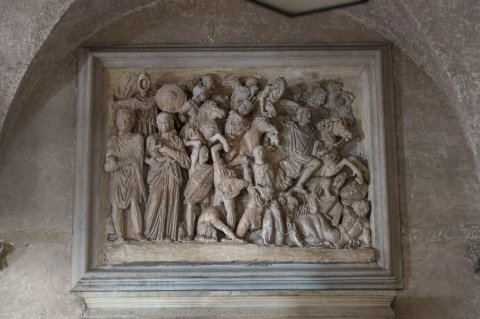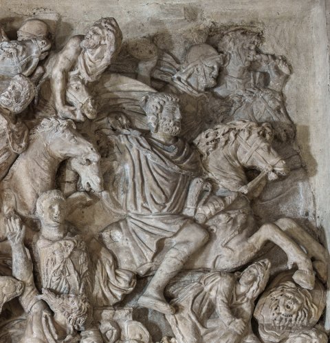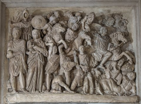 - Schlacht Römer gegen Barbaren. Nach rechts sprengende Reitersoldaten, unten gefallene Gegner. Links vor einem Tropaion stehende Gefangene, Mann in Hosen, Frau mit Kind an der Brust.