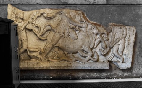 - Mythos (Mithras): Stiertötung (Tauroktonie) mit Cautes und Cautopates, Skorpion, Schlange und Hund.