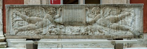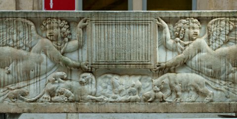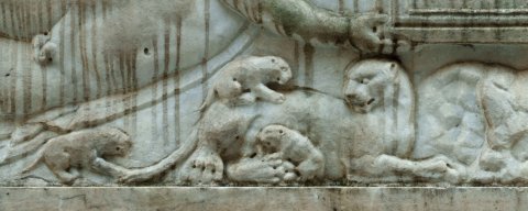 - Auf der Vorderseite zwei schwebende Eroten, die eine Schrifttafel halten, darunter Pantherfamilie. An den vier Ecken Säulen mit Spiralkannluren, Rückseite mit Riefeln.