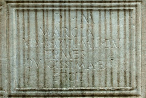 - D(is) M(anibus) / Marcia / vix(it) a(nnos) XXVIII m(enses) III d(ies) X / (H)ermes / dulcissimae / fecit