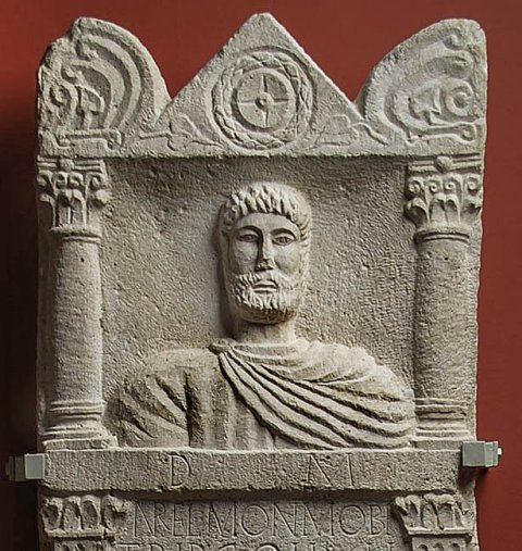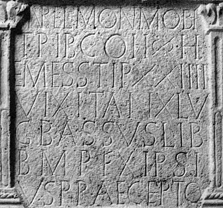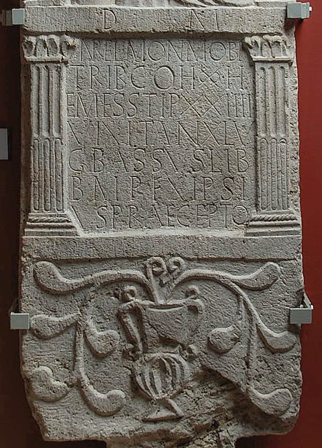 - D(is) M(anibus) // Aurel(io) Monimo b(ene)f(iciario) / trib(uni) coh(ortis) |(miliariae) H/emes(enorum) stip(endiorum) XXIIII / vixit an(nos) XLV / G(aius) Bassus lib(ertus) / b(ene) m(erenti) p(osuit) ex ipsi/us praecepto